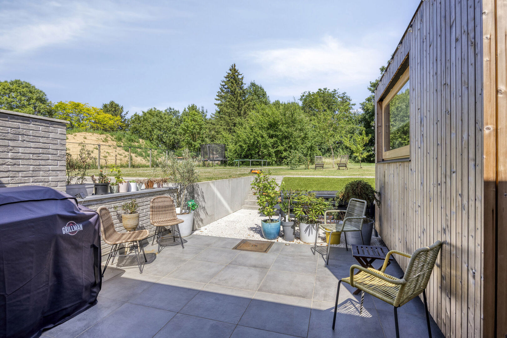 The entrance hall (15 m²) with guest toilet and cloakroom leads into the bright living area with an open kitchen. This spacious 44.7 m² living room, equipped with underfloor heating, opens onto a large, low-maintenance terrace (46.1 m²), partly tiled and partly finished with white gravel. It overlooks a wooded area at the rear, ensuring maximum peace and privacy – with no overlooking or fencing.