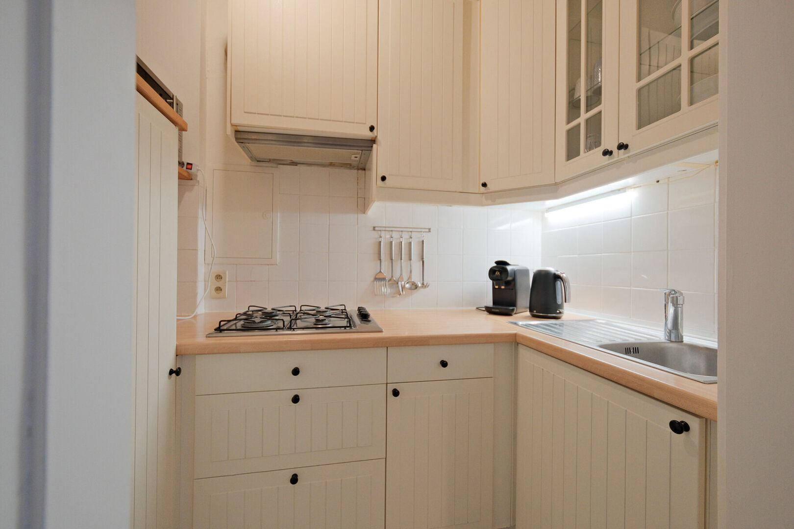 The semi-open kitchen includes all basic amenities. At the back, you’ll find the bedroom (10.2 m²) with shutters for optimal sleeping comfort. The shower room with toilet (3.3 m²) is well-maintained and functional, with a washbasin integrated into a cabinet.