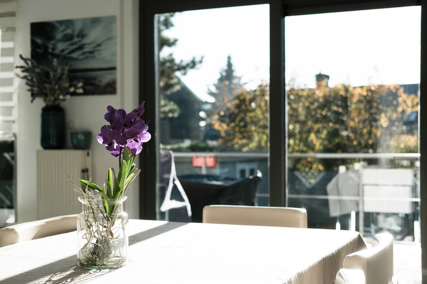 Large windows offer direct access to the south-east facing terrace (25.4 m²) with manual sunshade and the low-maintenance garden — perfect for sunny breakfasts or summer evenings with friends.