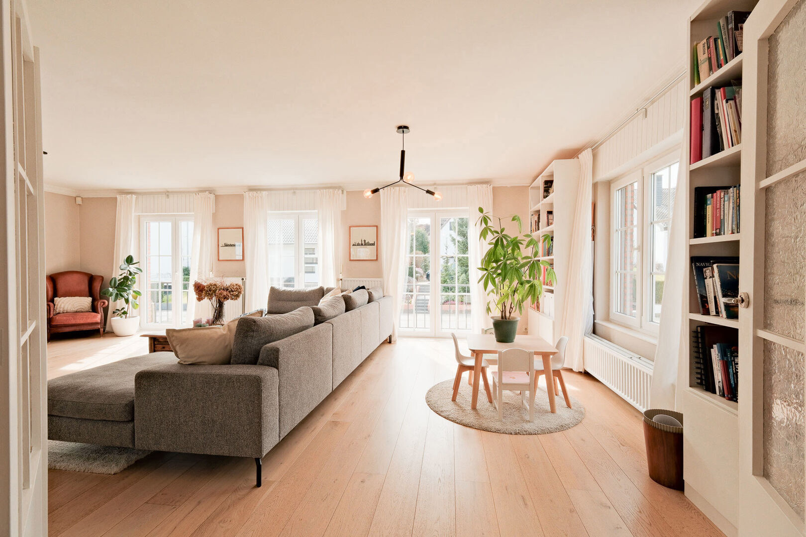 Spacious living room (75 m²) with parquet flooring and fireplace