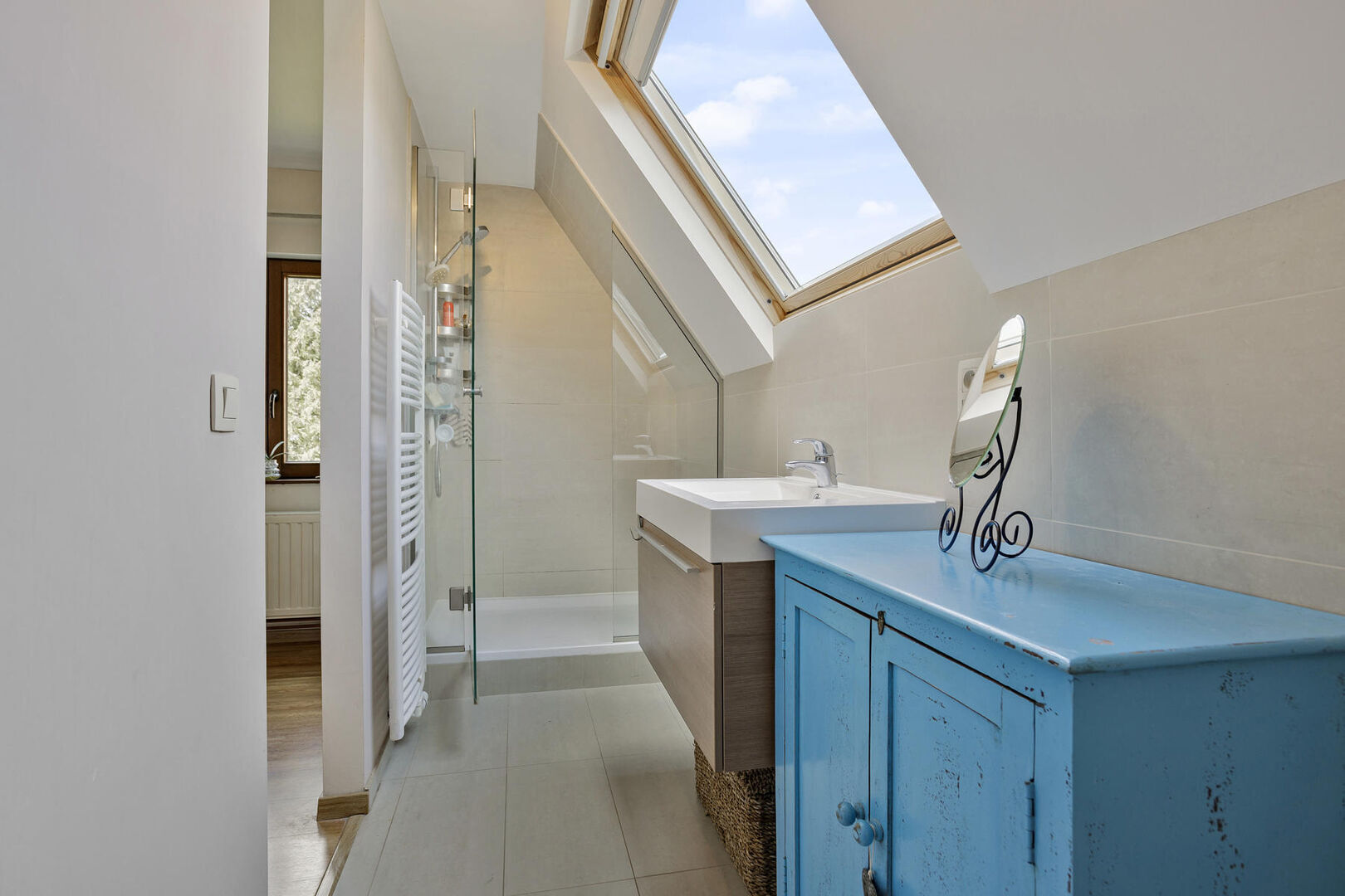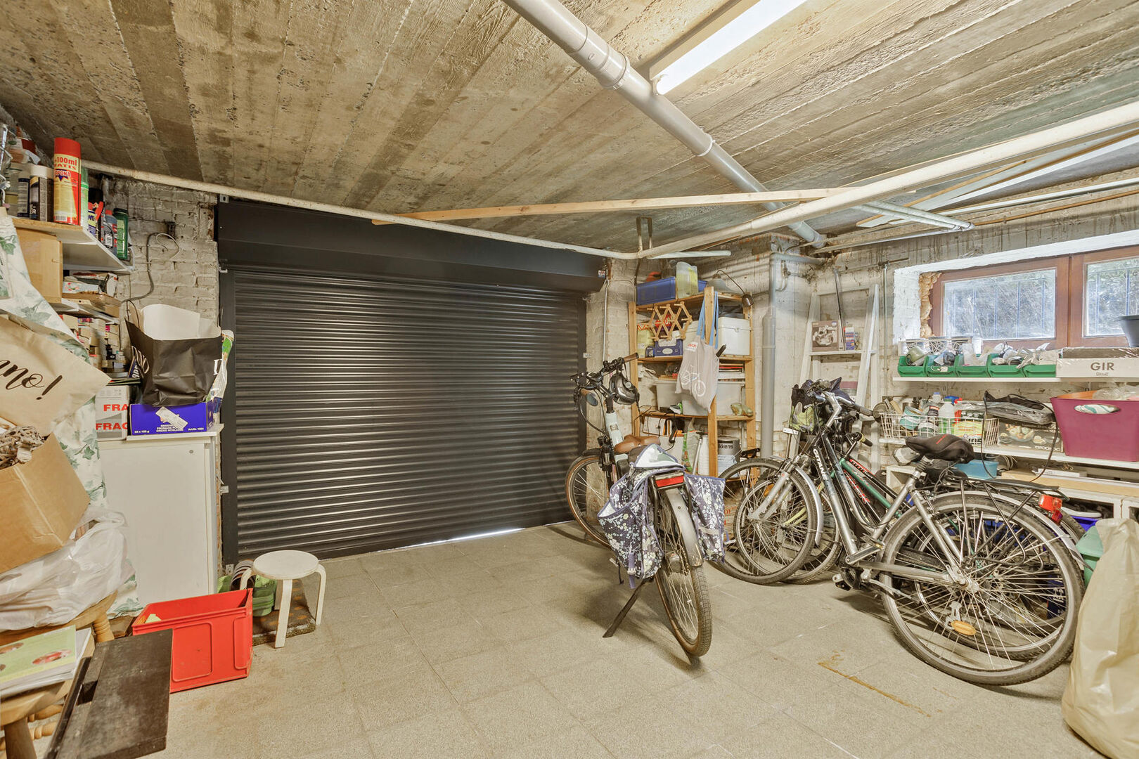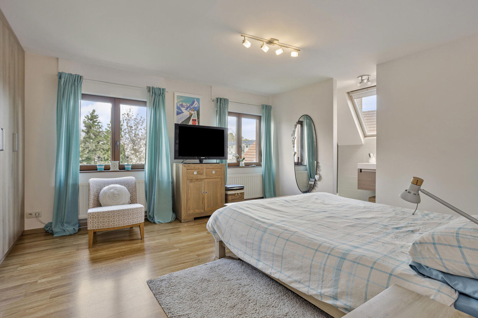 The accommodation comprises: a 7,5 m² entrance hall with toilet – a 21 m² living room with open fire – a 28 m² dining room - an 18,4 m² fully equipped kitchen with fridge with freezer compartment, dishwasher, microwave oven, ceramic hob,oven – 5 bedrooms (of which 3 bedrooms with laminate floor and fitted wardrobes, two with carpet) of 16 m² / 11,7 m² / 14,5 m² 12,4 m² and 14,7 m² respectively – a 5,8 m² bathroom with bath / shower, one vanity and a toilet – a 5,1 m² shower room with shower cabin and a toilet – a 20,2 m² one-car garage – a 45 m² cellar with laundry room – 2 outdoor parking spaces – a private garden (facing north-west) and a 12 m² terrace (facing north-west).