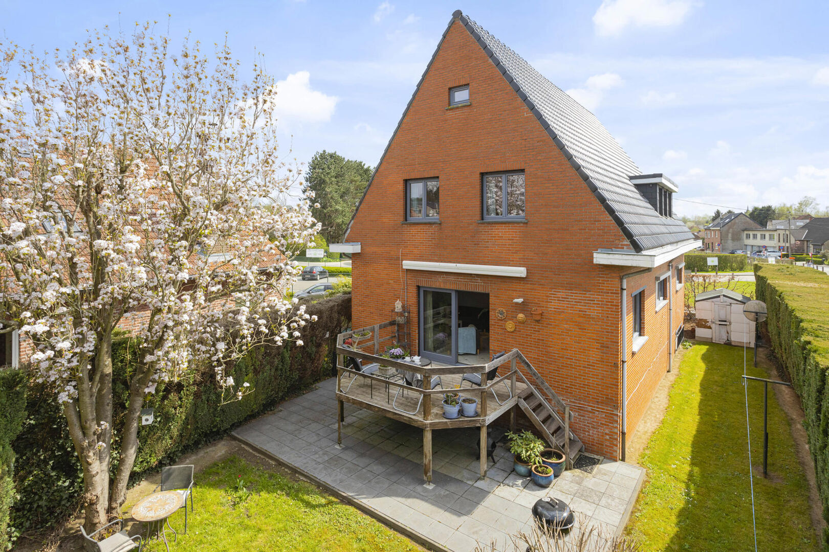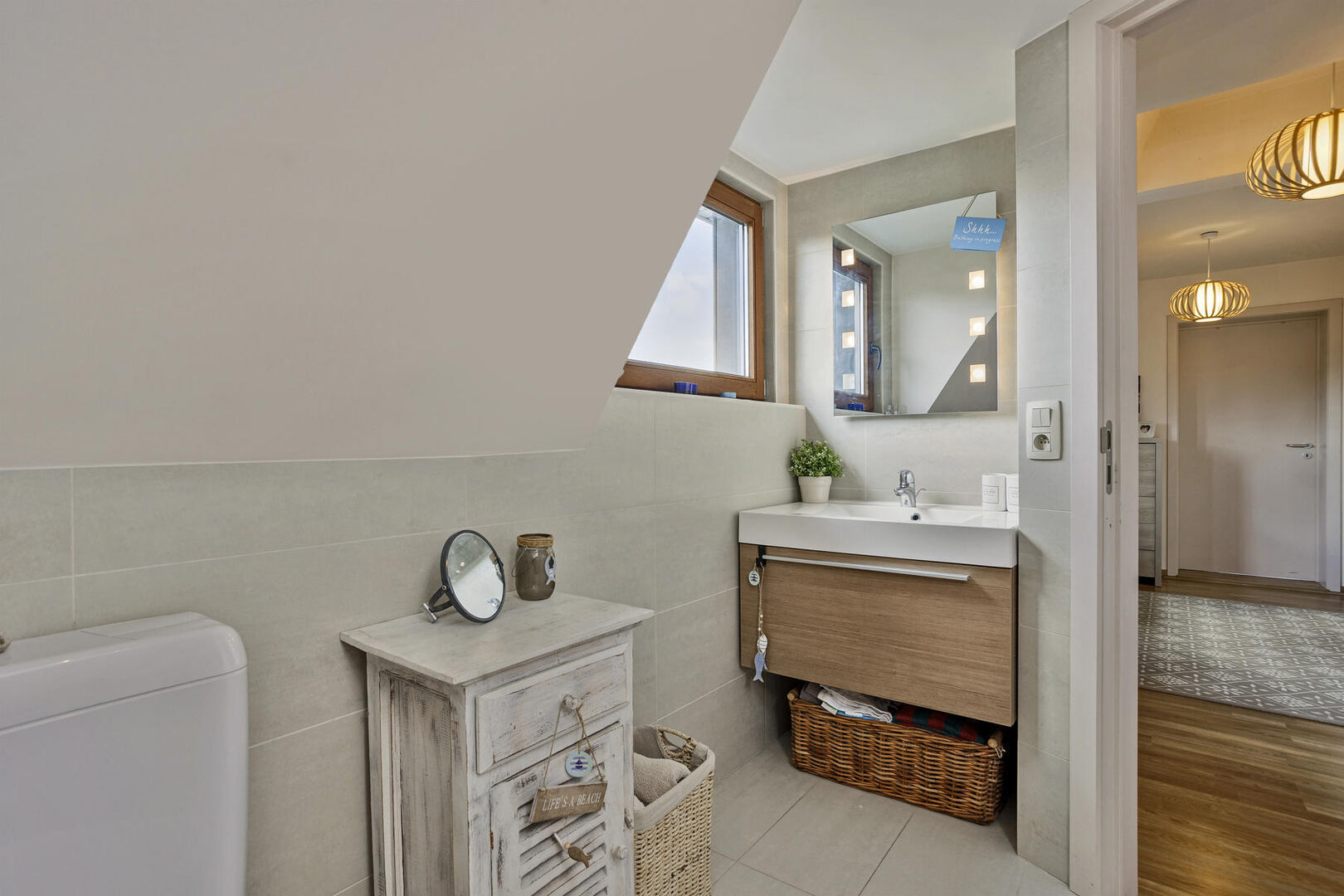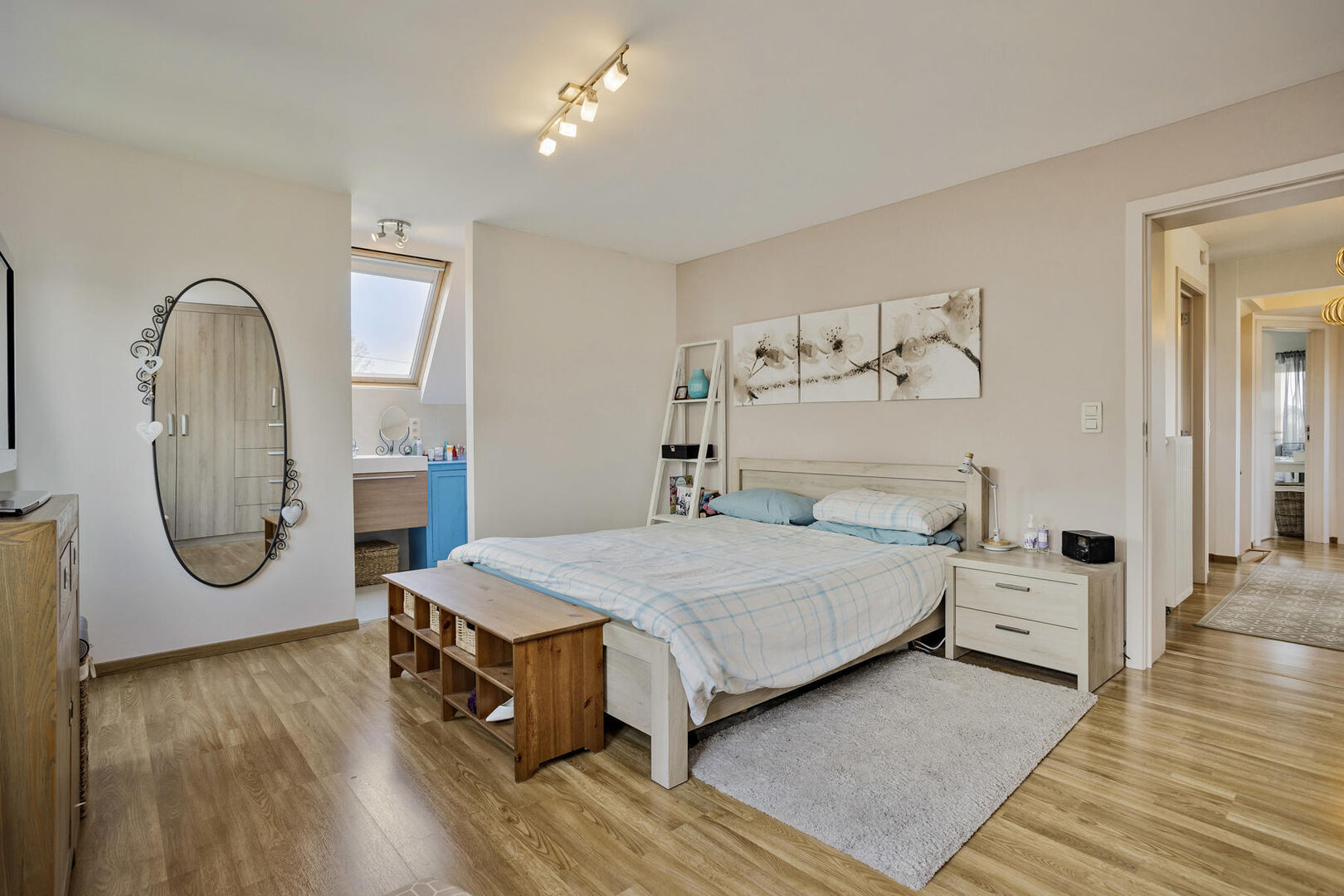 The accommodation comprises: a 7,5 m² entrance hall with toilet – a 21 m² living room with open fire – a 28 m² dining room - an 18,4 m² fully equipped kitchen with fridge with freezer compartment, dishwasher, microwave oven, ceramic hob,oven – 5 bedrooms (of which 3 bedrooms with laminate floor and fitted wardrobes, two with carpet) of 16 m² / 11,7 m² / 14,5 m² 12,4 m² and 14,7 m² respectively – a 5,8 m² bathroom with bath / shower, one vanity and a toilet – a 5,1 m² shower room with shower cabin and a toilet – a 20,2 m² one-car garage – a 45 m² cellar with laundry room – 2 outdoor parking spaces – a private garden (facing north-west) and a 12 m² terrace (facing north-west).