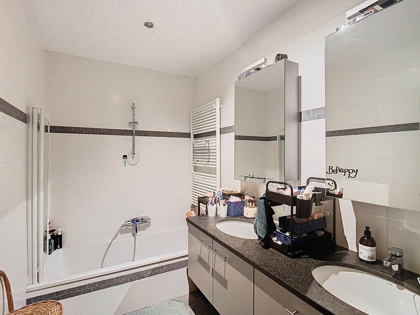 - Salle de bains avec bain/douche et double lavabo intégré dans un meuble