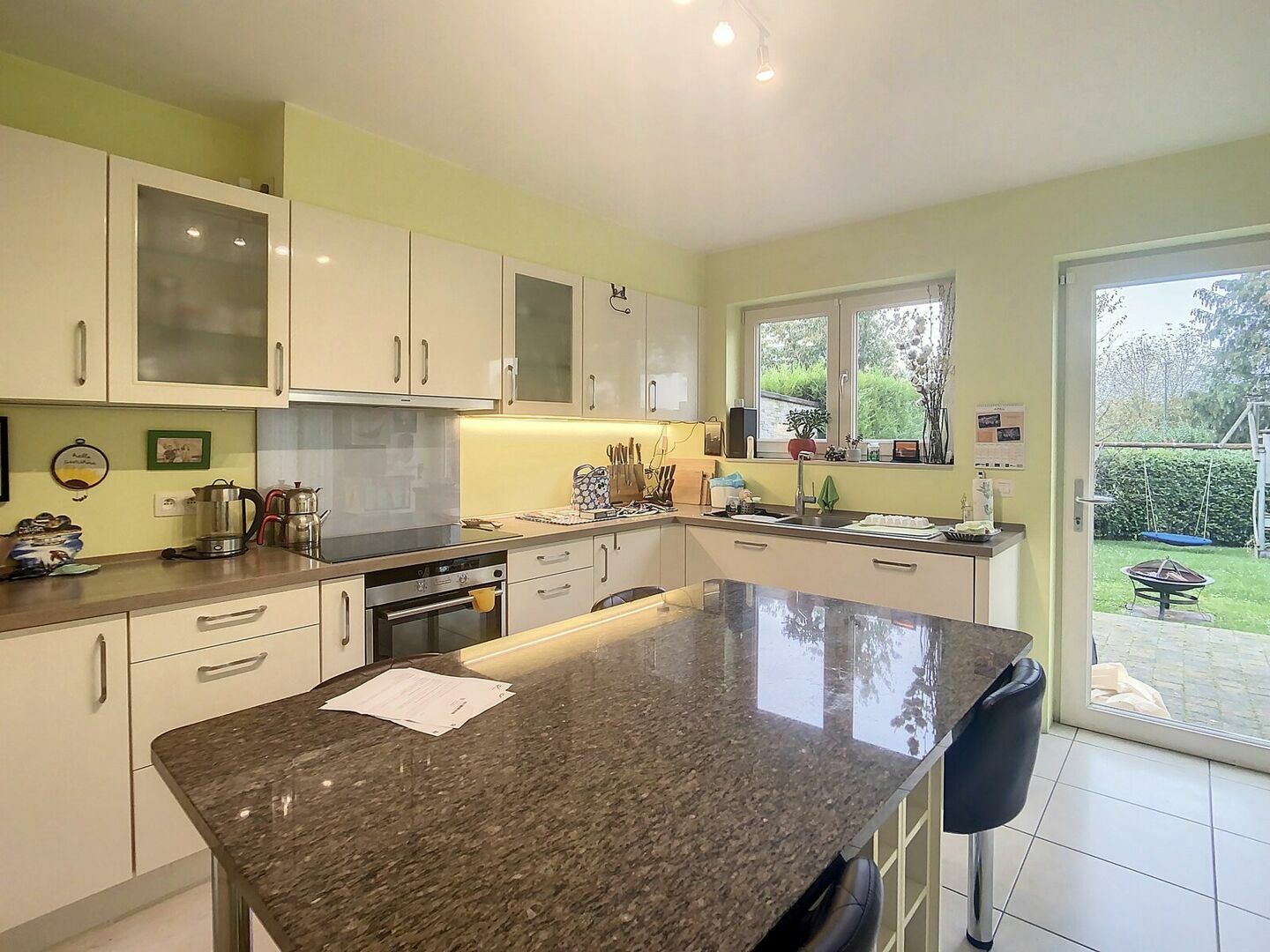 La maison dispose d’une cuisine fermée de 13,7 m² avec coin petit-déjeuner. Elle est presque entièrement équipée (réfrigérateur, congélateur, four, cuisinière et plaque à induction) et complétée par une buanderie pratique.