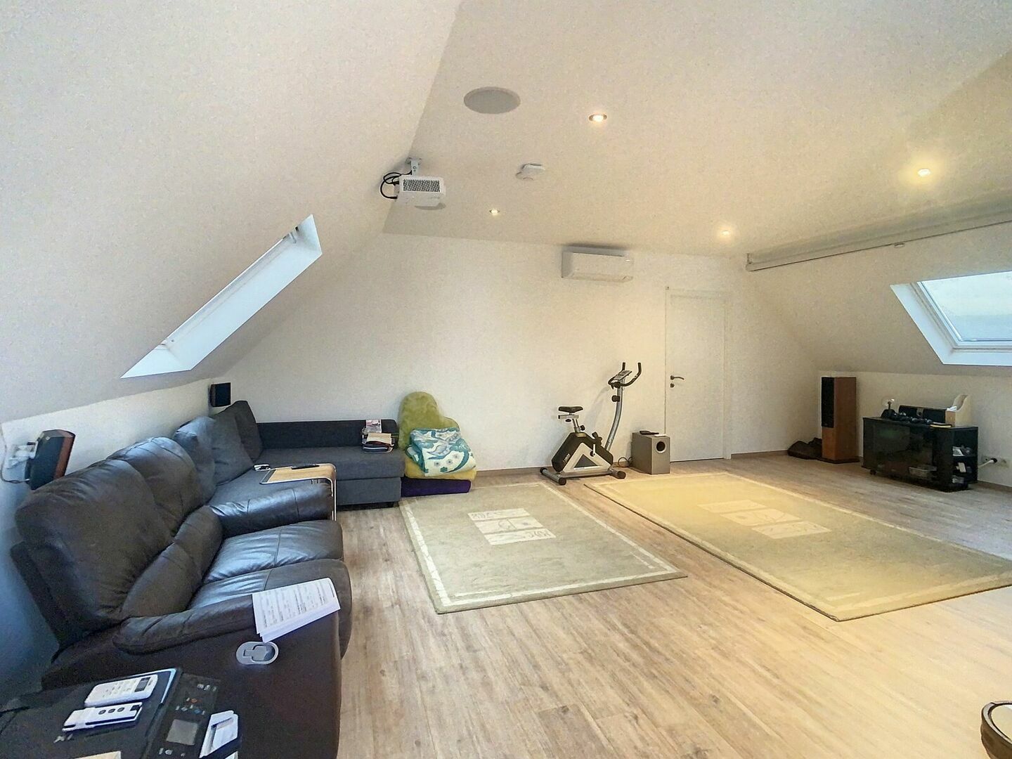 Aux étages, vous trouverez trois grandes chambres, une chambre plus petite ainsi qu’un espace polyvalent de 30 m², parfait comme bureau, salle de loisirs ou salle de jeux. La maison comprend également une salle de bains et deux salles de douche séparées.