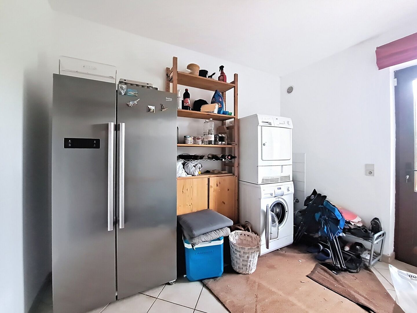 La maison se compose d'un hall d'entrée avec vestiaire (carrelage au sol), d'un salon et d'une salle à manger avec cheminée, d'une cuisine équipée (réfrigérateur-congélateur, lave-vaisselle, four et cuisinière en céramique) (carrelage au sol), de 4 chambres : 22,96m², 13,86m², 18m², 15. 94m² (vinyle), salle de bain avec baignoire, WC, bidet et 2 lavabos dans les meubles, salle de bain avec baignoire, WC et 1 lavabo, salle de douche avec WC et 1 lavabo dans les meubles, buanderie, bureau, cave 6m², garage pour 2 voitures et 2 espaces extérieurs, jardin avec abri de jardin (OU ouest), terrasse 20m².