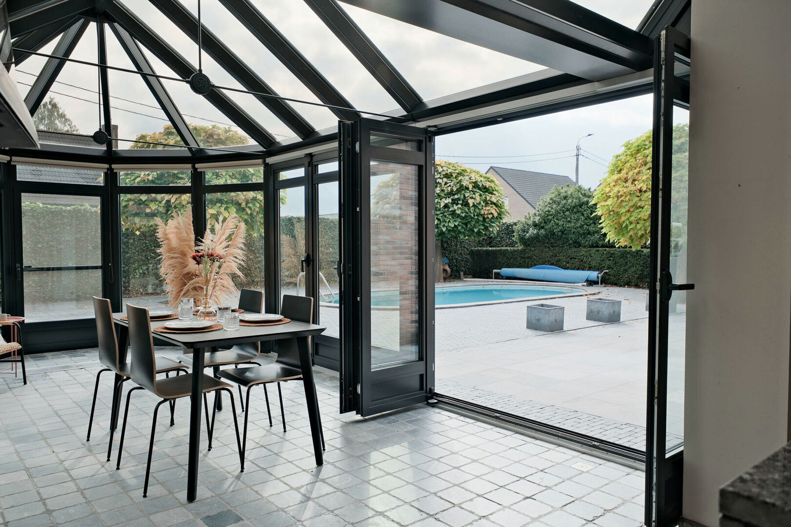 La véranda en aluminium entièrement vitrée (2003) constitue un véritable espace de vie supplémentaire et donne accès à la grande terrasse avec tente solaire automatique ainsi qu’à la piscine de 8 x 3 mètres.