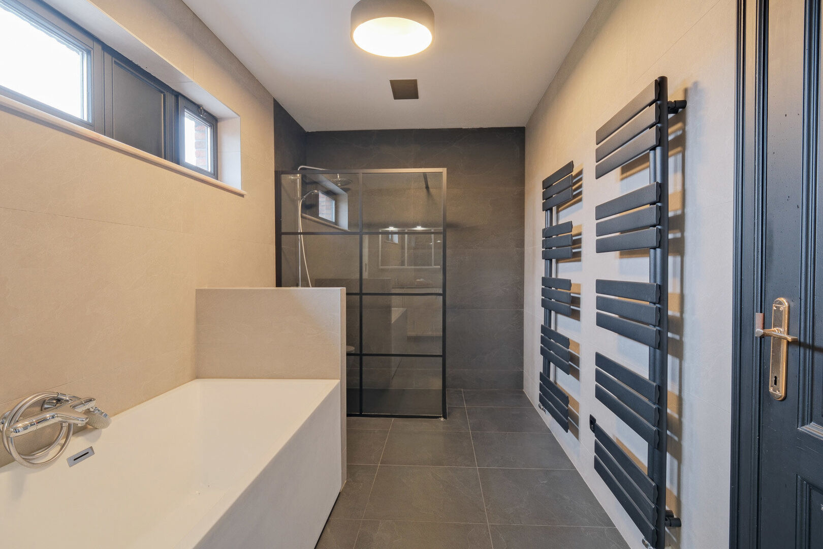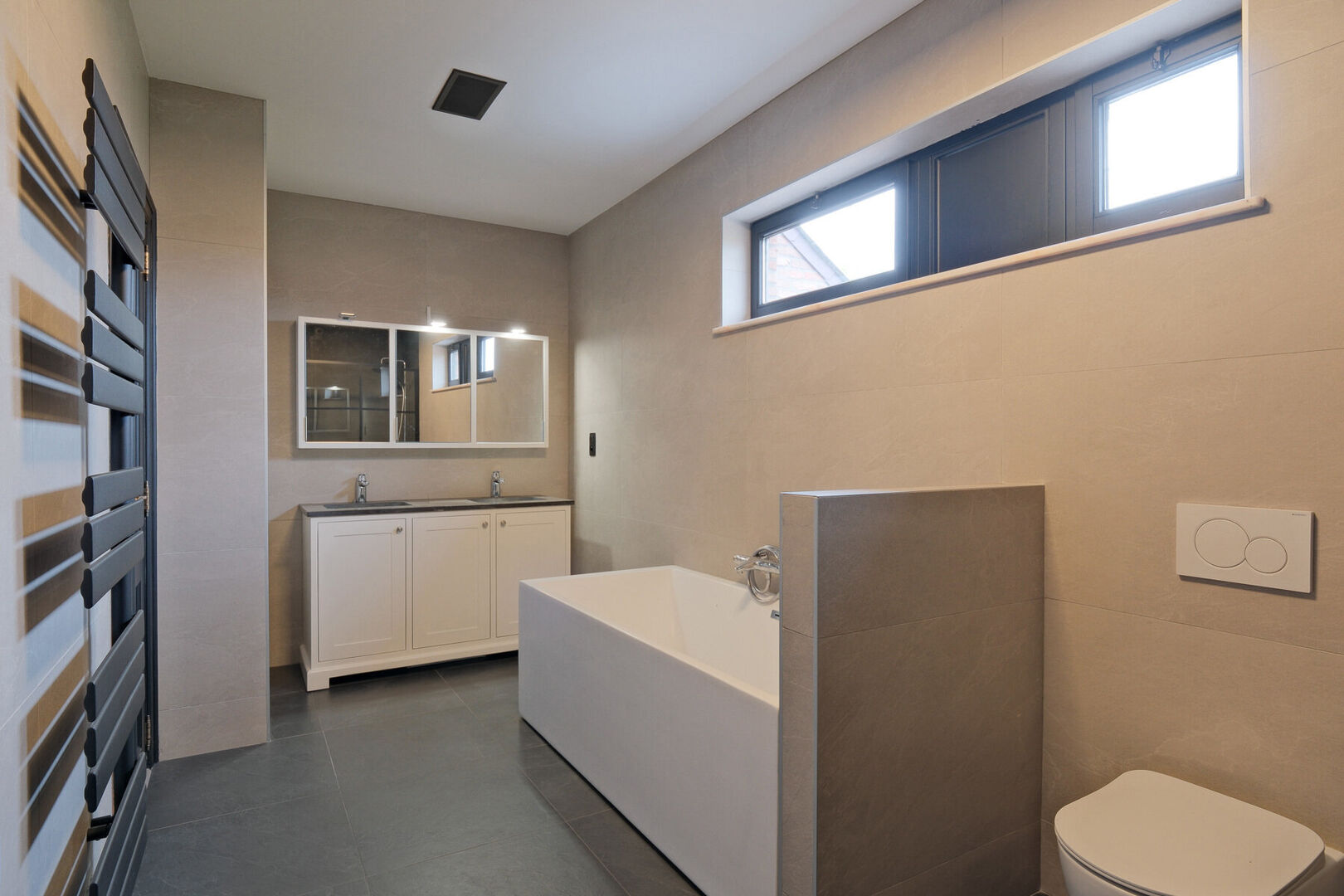 Salle de bains récemment rénovée avec double lavabo intégré, baignoire, douche à l’italienne et deux radiateurs sèche-serviettes.