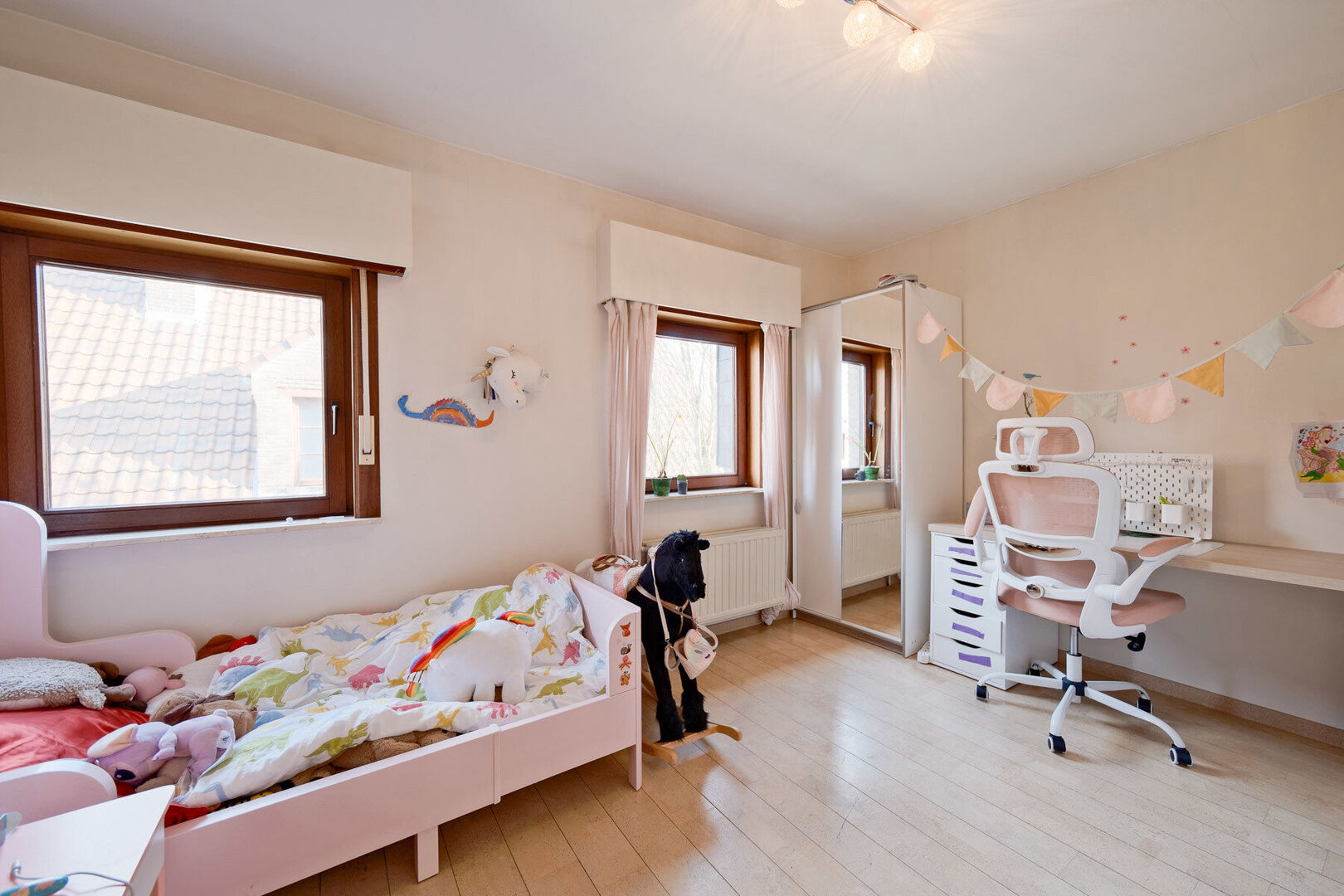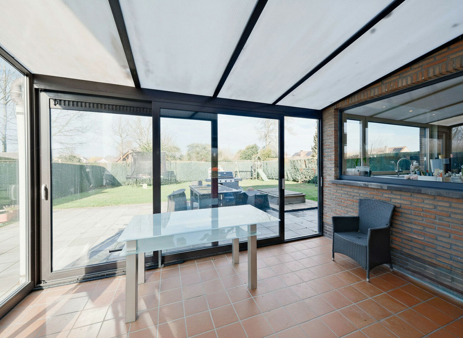 La véranda (±14,1 m²) prolonge agréablement l’espace de vie et donne accès à la terrasse NW (±47,2 m²) et au jardin entièrement clôturé, idéal pour enfants et animaux.