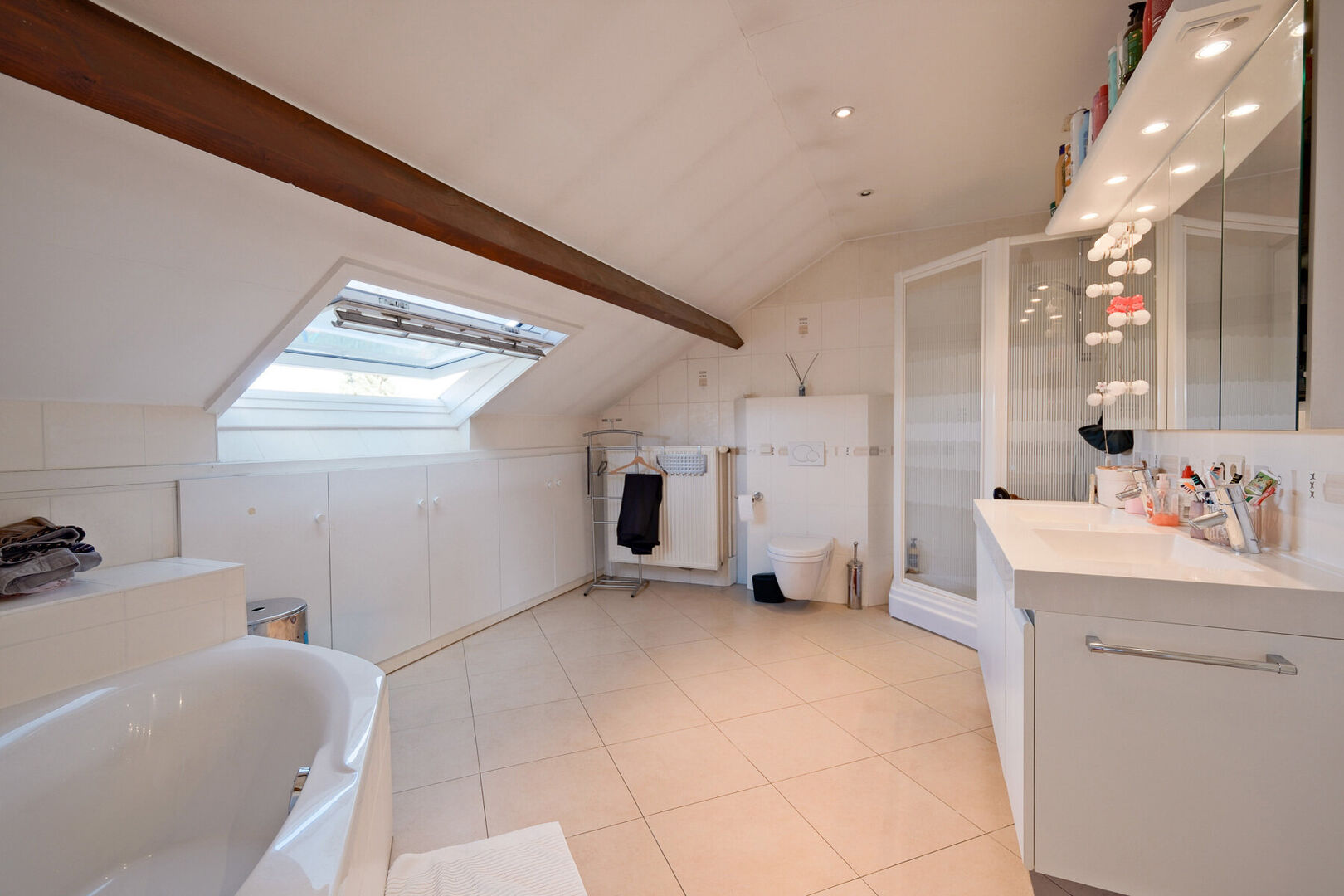Salle de bains complète avec baignoire, douche, toilette et double lavabo.