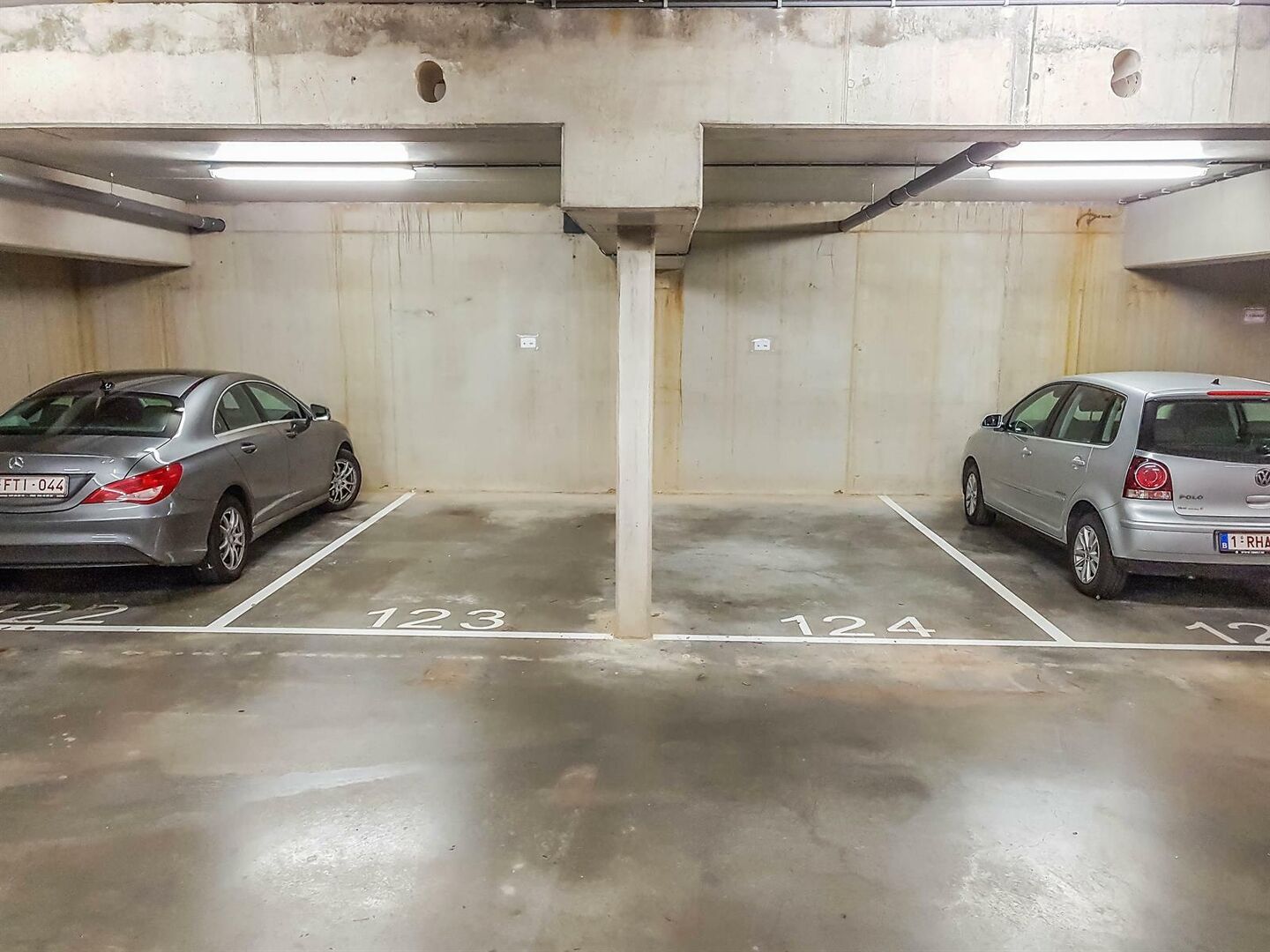 Inkomhal met vestiaire (tegelvloer) - woonkamer 34m² (tegelvloer) - volledig ingerichte keuken 5,3m² (tegelvloer): koelkast met vriesvak, vaatwasmachine, microgolfoven, oven, inductie kookvuur - 2 slaapkamers (tegelvloer): 10m² / 12m² - badkamer met bad, douchecabine en 2 lavabo's in meubel - toilet - berging 3,9m² (tegelvloer) - kelder 4,5m² - parkeerplaats voor 2 wagens in ondergrondse garage - overdekt terras 36m² (or west) + groen dak.