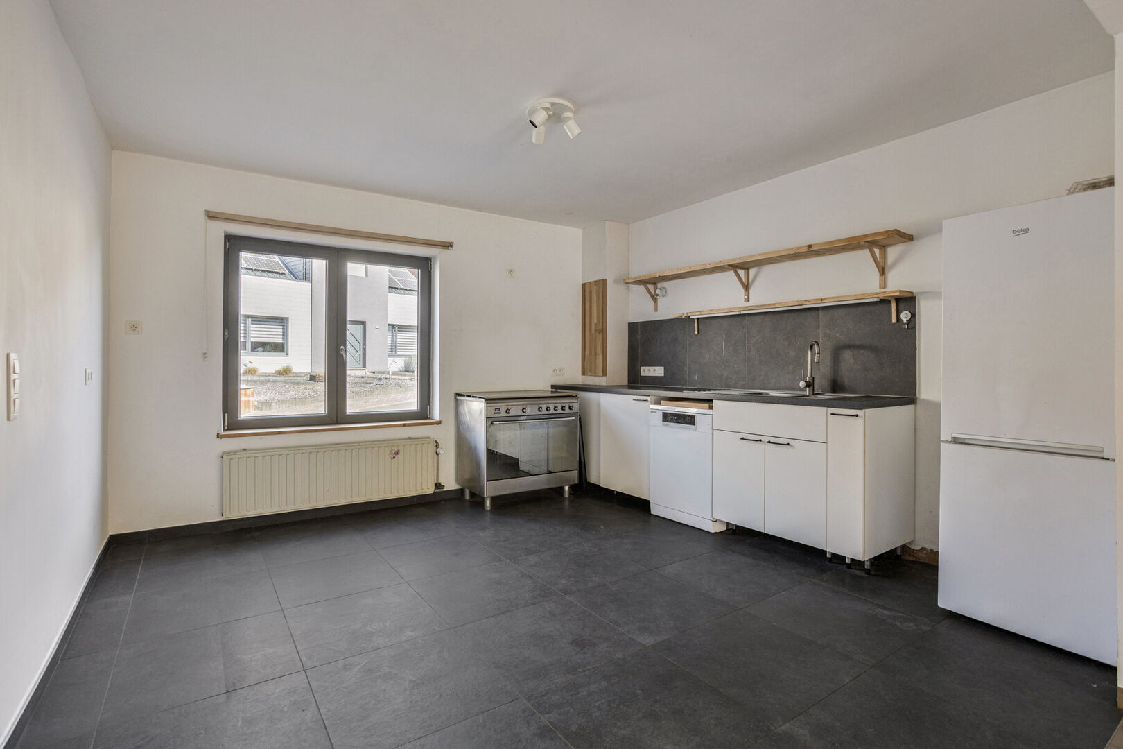 - Gelijkvloers: inkomhal (12 m²), keuken (15,7 m² – voorbereid, nog verder af te werken), eetkamer (16,5 m²), lichtrijke woonkamer (43,2 m²) met schuifraam over de volledige breedte en zicht op tuin en weilanden, badkamer (6,7 m²) met ligbad, douche en toilet.