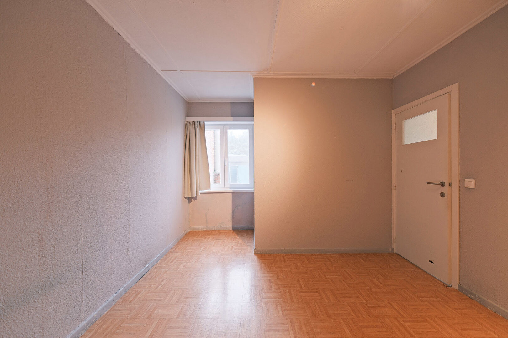 Gelijkvloers: gemeenschappelijke inkom tot private voordeur, woon-/eetkamer 32,7 m² (laminaat, gaskachel), semi-open keuken 6,6 m² (te renoveren), douchekamer met toilet en lavabo-meubel + plaats voor wasmachine, toegang tot de koer 26 m² (W-georiënteerd, deels onder afdak).