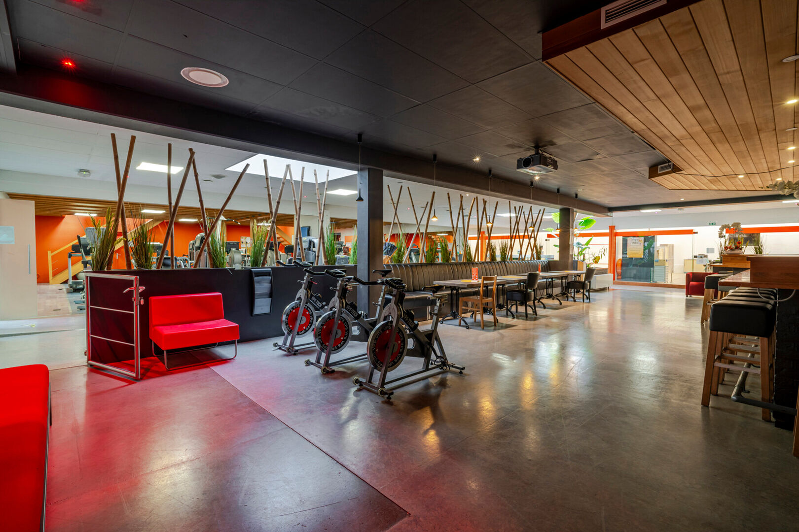 - 2 fitnesszalen verdeeld over gelijkvloers en eerste verdieping