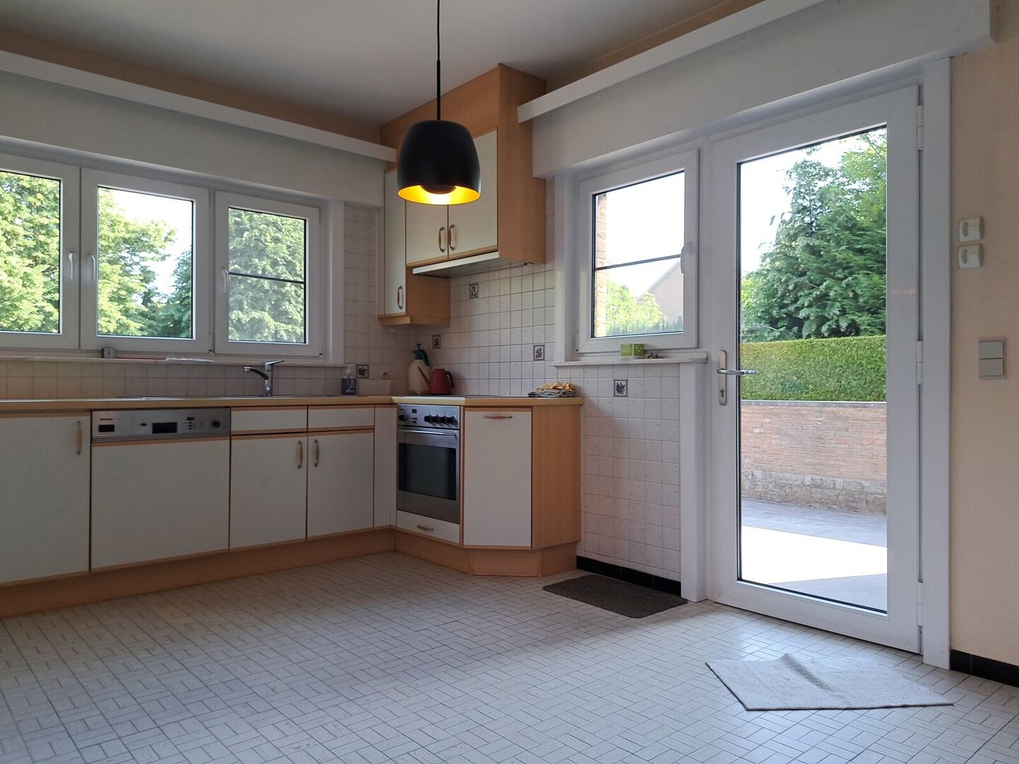 De woning bestaat uit: inkomhal met toilet 7m² (tegelvloer) - woonkamer 44,4m² (tegelvloer) - volledig ingerichte keuken 16,5m² (tegelvloer) met ontbijthoek: koelkast, vaatwasmachine, oven, microgolfoven, diepvriezer, keramisch kookvuur - 3 slaapkamers: 16,9m² / 17,4m² / 9,9m² - badkamer met bad/douche, toilet en 2 lavabo's in meubel 15,3m² (NIEUW!) - garage voor 1 wagen, met elektrische poort 28,5m² - zolder 48m² - kelder 43,4m² - tuin (or Zuid) met terras 19m² (or Zuid) - 3 parkeerplaatsen buiten.
