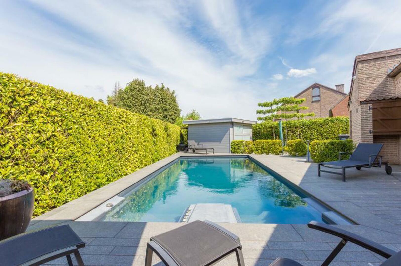 De woning bestaat uit: inkomhal 10,30 m² (tegelvloer) met toilet en vestiaire - woonkamer 33,40 m² (tegelvloer) - eetkamer 20,80 m² (tegelvloer) met open haard - open keuken 21,20 m² met ontbijthoek, koelkast met vriesvak, vaatwasmachine, microgolfoven, oven, ingebouwde friteuse, bordenverwarmer en inductie kookvuur - bureau 7,90 m² - 3 slaapkamers (laminaat): 9,50 m² / 11,60 m² / 17,20 m² met ingebouwde kasten en dressing 19,90 m² - douchekamer 4 m² met douchecabine en 2 lavabo's in meubel - 1 toilet - omheinde tuin met zwembad en tuinhuis (or. N) - terras (or. N) - garage 22,20 m² voor 1 wagen met elektrische poort - 2 parkeerplaatsen buiten.