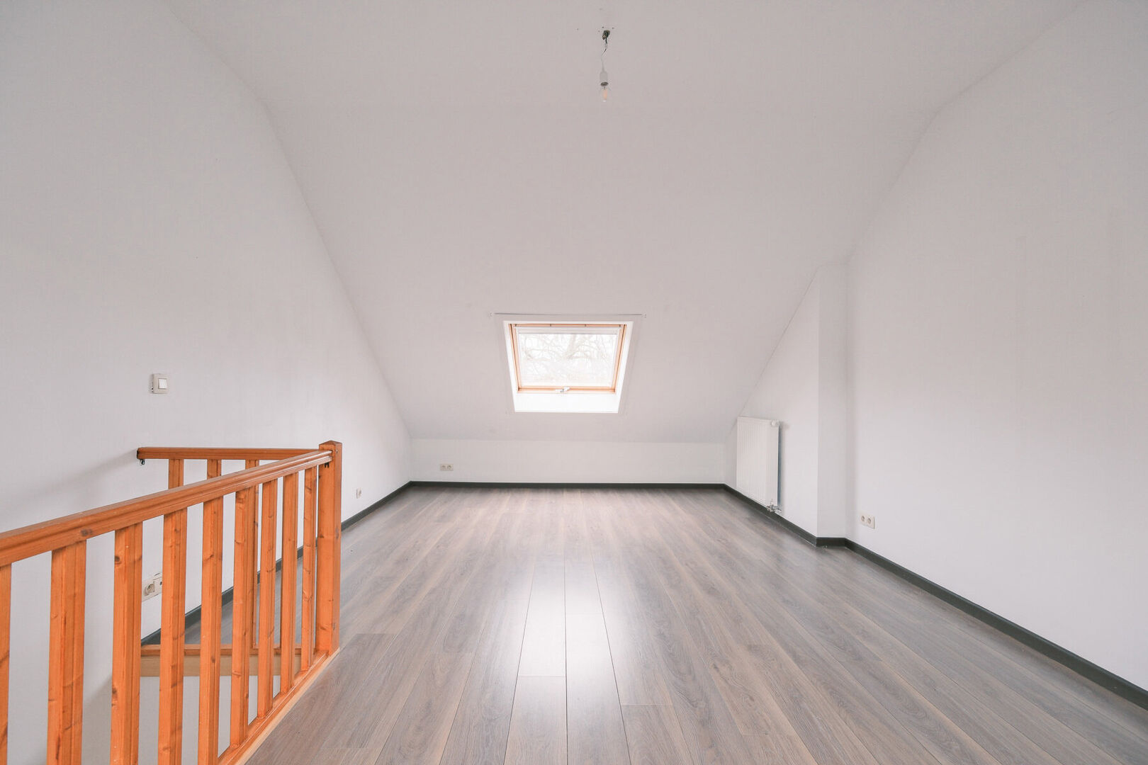 • Tweede verdieping: Zeer grote kamer (28 m²) die makkelijk opgesplitst kan worden in twee kamers van 12 m² door middel van valse wanden. De ruimte is voorzien van Velux ramen langs beide kanten en een laminaat vloer.