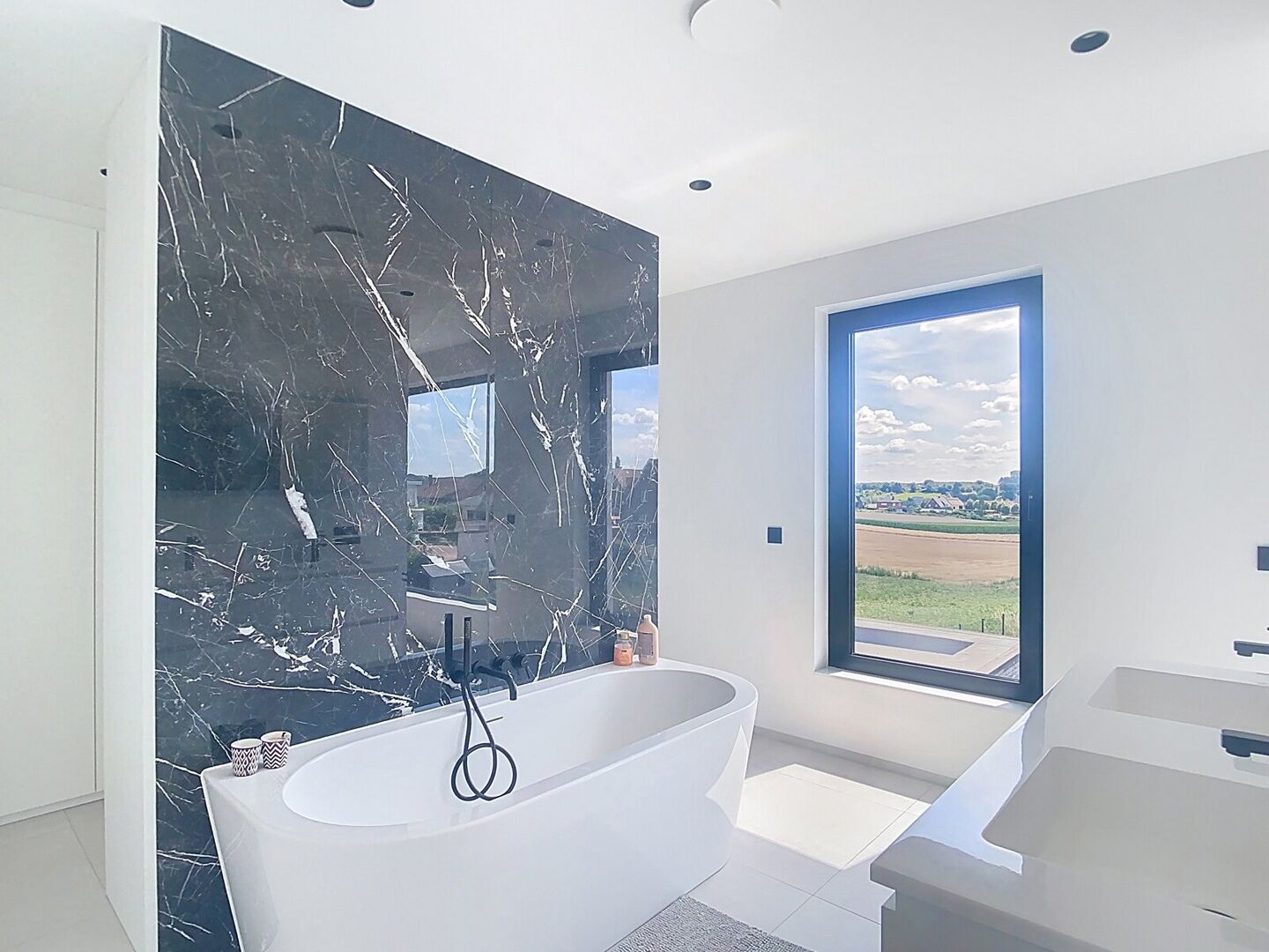Op de eerste verdieping bevinden zich vier slaapkamers met tegelvloer. De master bedroom beschikt over een eigen dressing van 8 m² en een en-suite badkamer met ligbad en dubbel lavabomeubel. Een tweede badkamer met douche en dubbele lavabo biedt extra comfort.