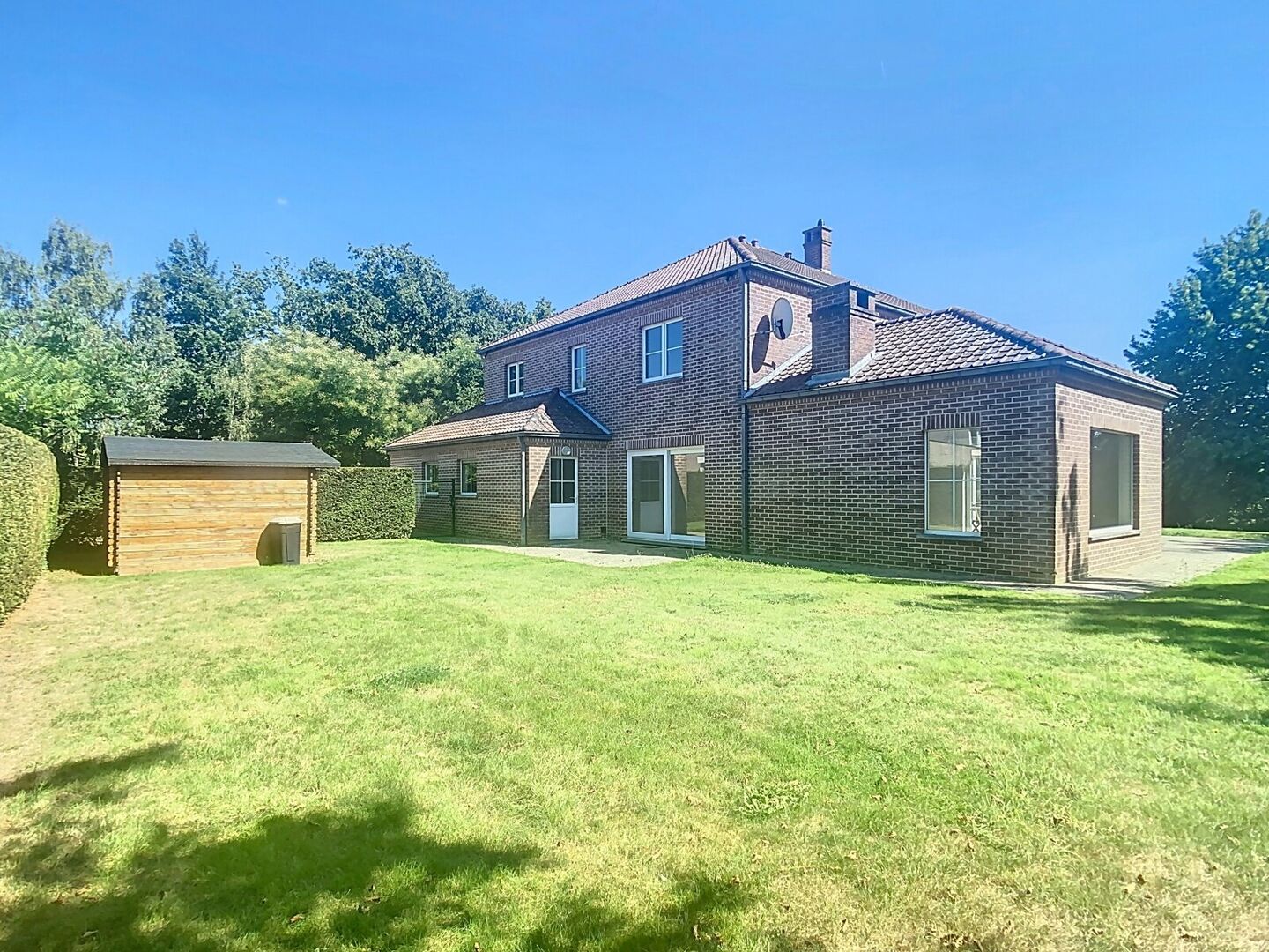 Inkomhal met toilet en vestiaire - woonkamer 46,3m² (tegelvloer) met open haard - eetkamer 13,7m² (tegelvloer) - volledig ingerichte keuken met ontbijthoek 20m² (tegelvloer): koelkast, vaatwasmachine, microgolfoven, oven, keramisch kookvuur - bureau 20m² - 5 slaapkamers (laminaat, 2x met ingebouwde kasten): 2x 16m² / 10,4m² / 20,5m² / 9m² - dressing 5m² - badkamer met bad, douchecabine en 1 lavabo in meubel - badkamer met bad, douchecabine, toilet en 2 lavabo's in meubel (ensuite slaapkamer 4) - douchekamer met douchecabine en 1 lavabo in meubel - berging 6,76m² - wasruimte 5m² (in garage) - garage voor 2 wagens, met afstandsbediening - zolder - kelder: provisiekelder 63m² / cv ruimte 12m² - tuin (omheind, or zuid) met terras 49m² en 17m².