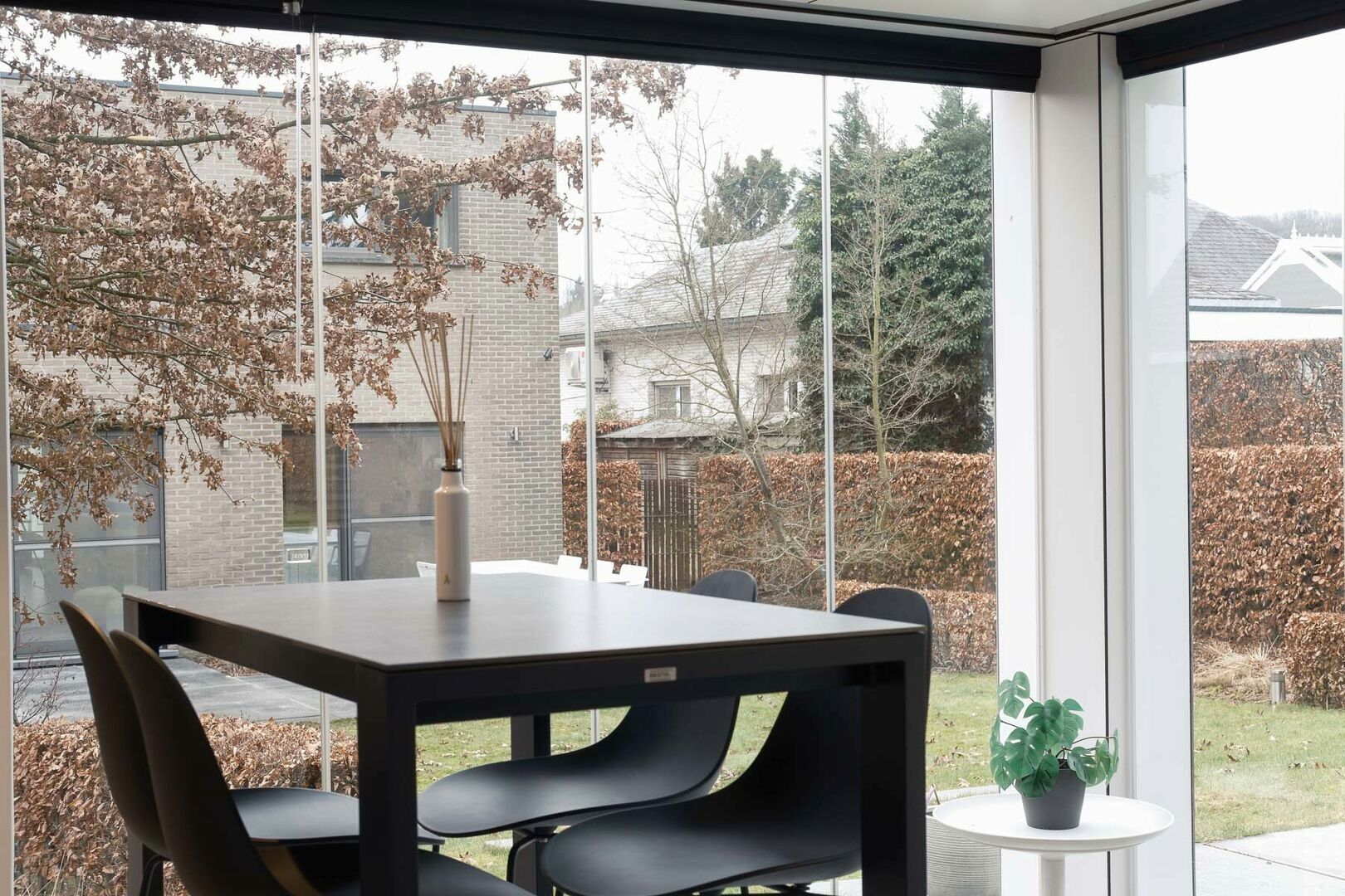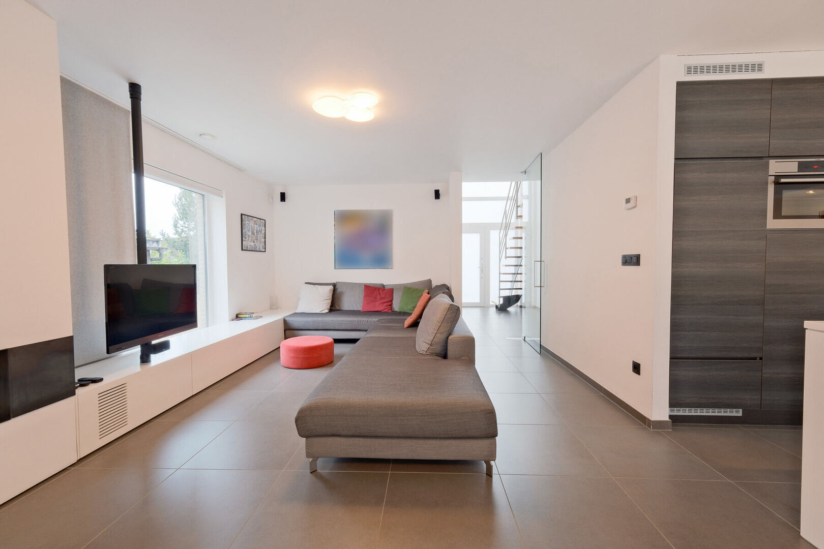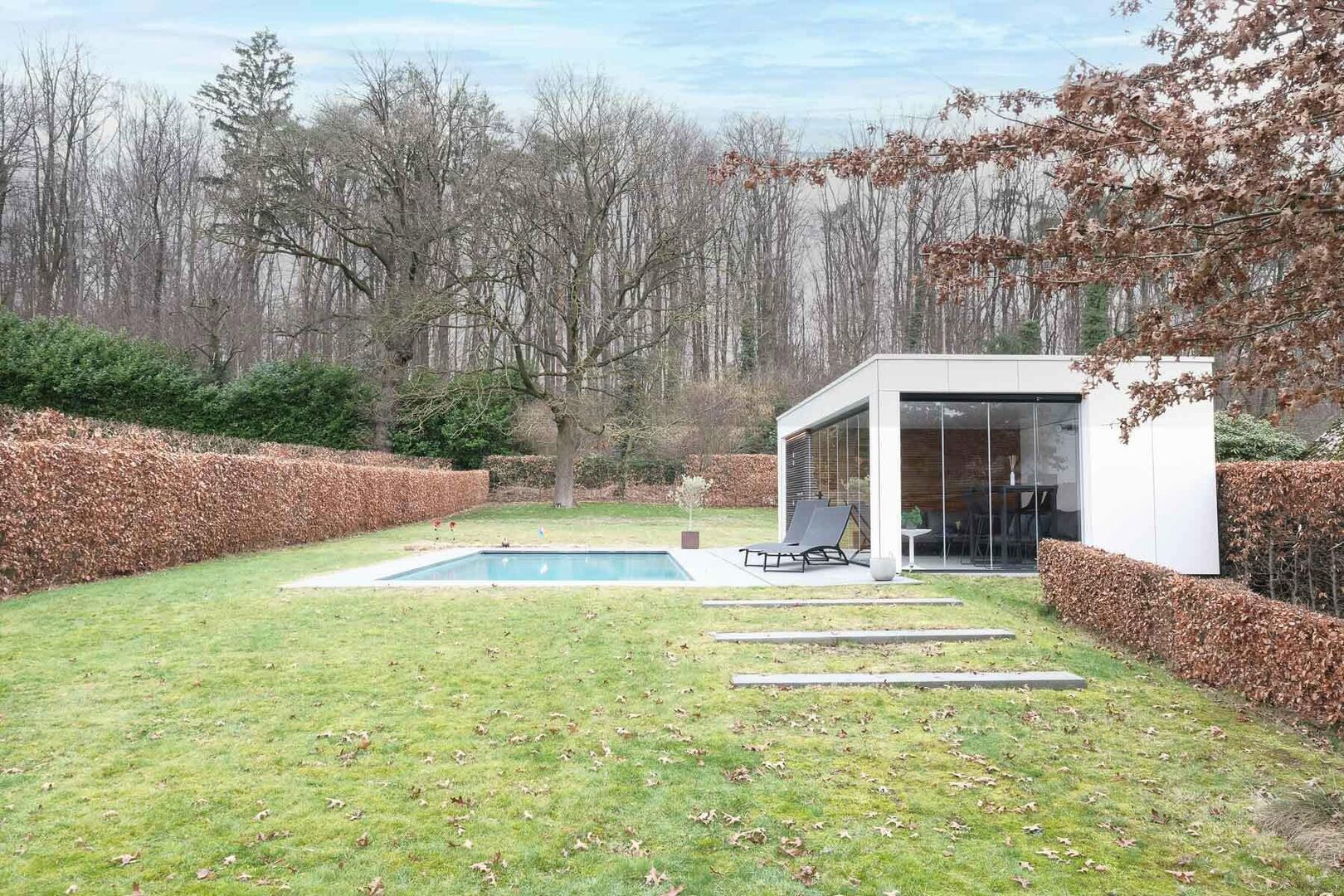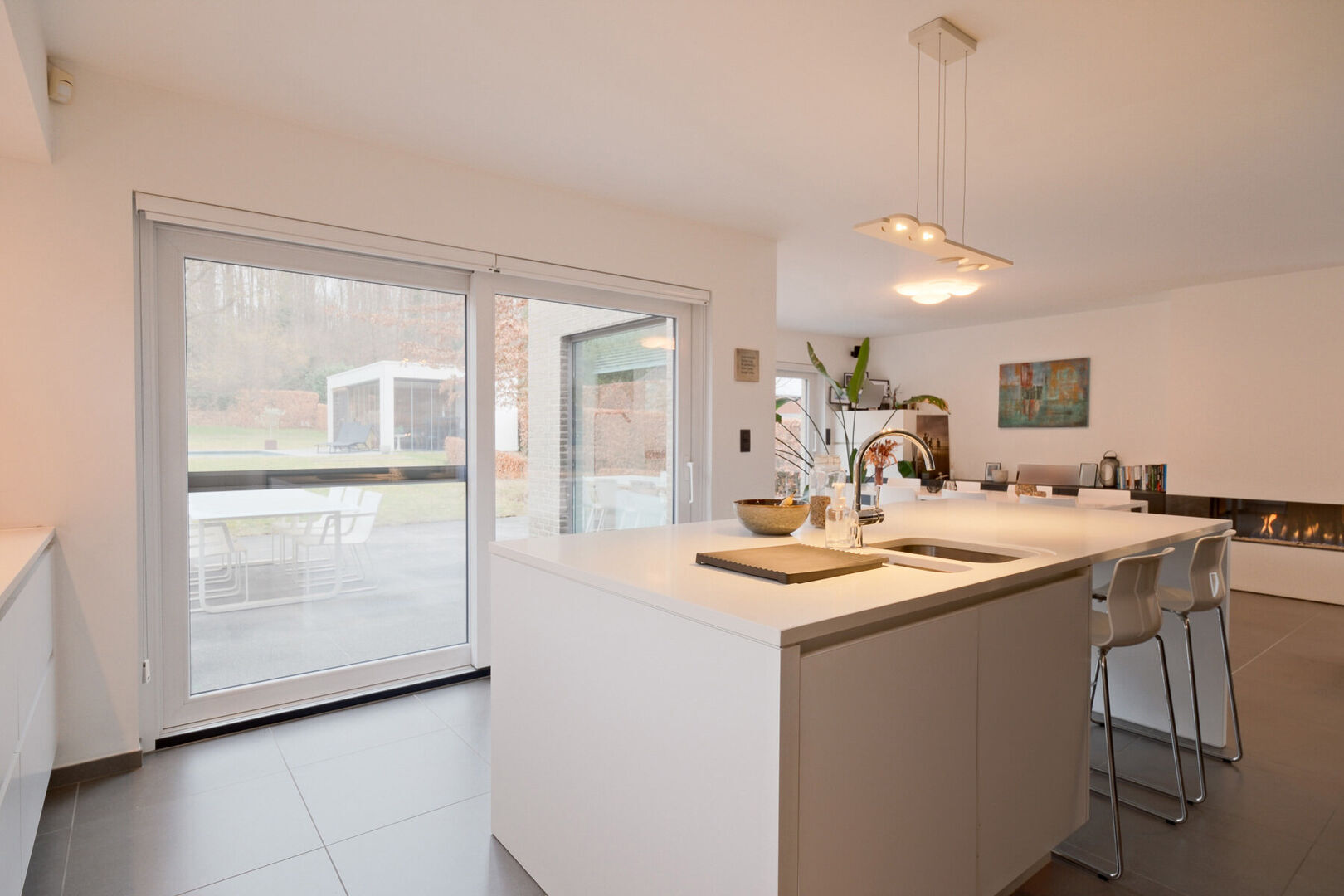 De woon- en eetkamer van 39,7 m² vormt het hart van de woning. Grote raampartijen creëren een sterke connectie met tuin, terras en zwembad. De ingebouwde gashaard versterkt het warme en stijlvolle karakter van de leefruimte.