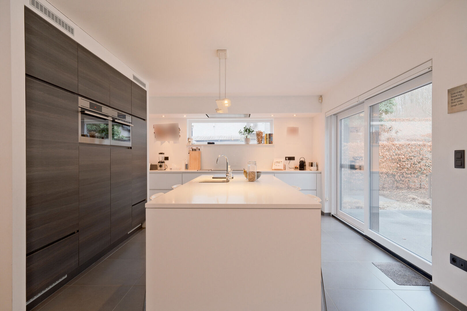 De open keuken (Dovy), uitgerust met kwalitatieve AEG-toestellen en een centraal keukeneiland, sluit naadloos aan op het leefgedeelte. Vanuit de keuken bereikt u het terras van 39,2 m² (NW-georiënteerd), ideaal voor ontspanning en ontvangst.