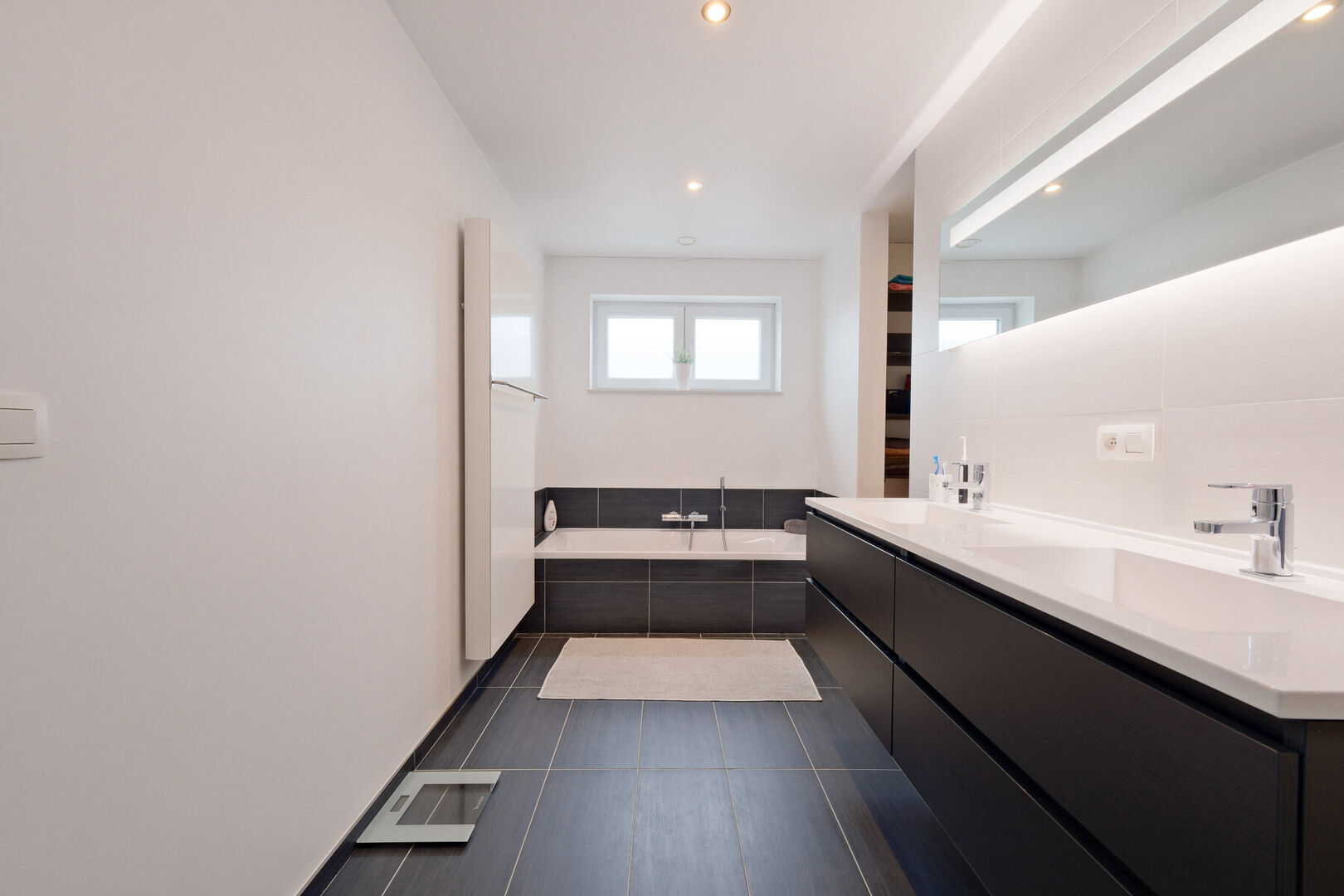 De ruime badkamer van 13,3 m² is uitgerust met ligbad, inloopdouche, dubbel lavabomeubel en toilet.