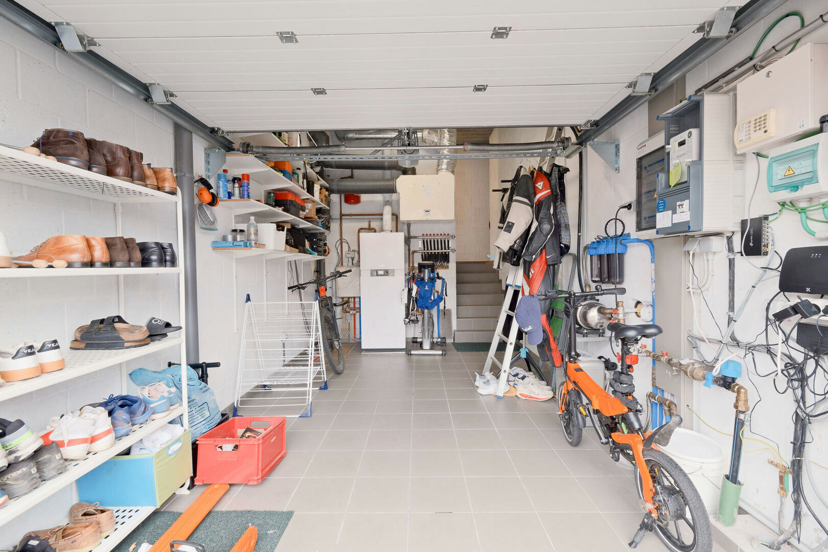 De inpandige garage van 17,2 m² beschikt over een functionele mezzanine van 9,8 m² voor bijkomende stockage. In de garage bevinden zich eveneens de technische installaties, waaronder waterverzachter, omvormer van de zonnepanelen en regenwaterpomp.