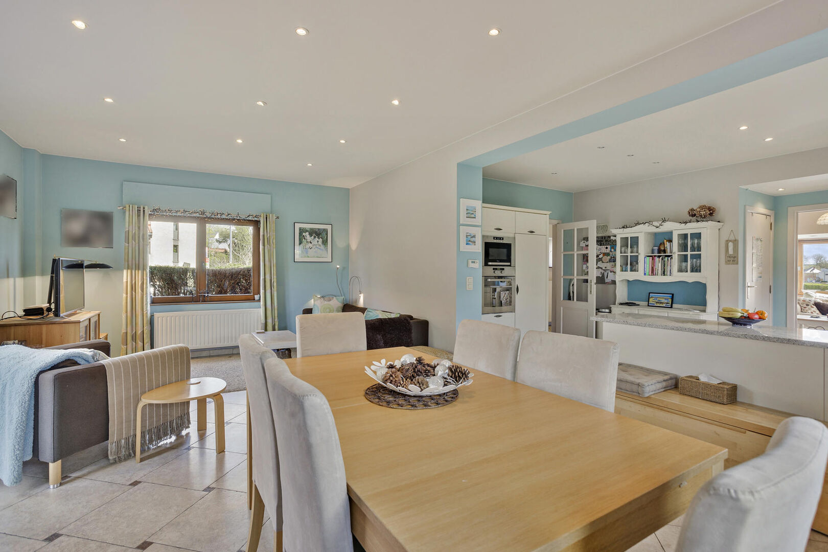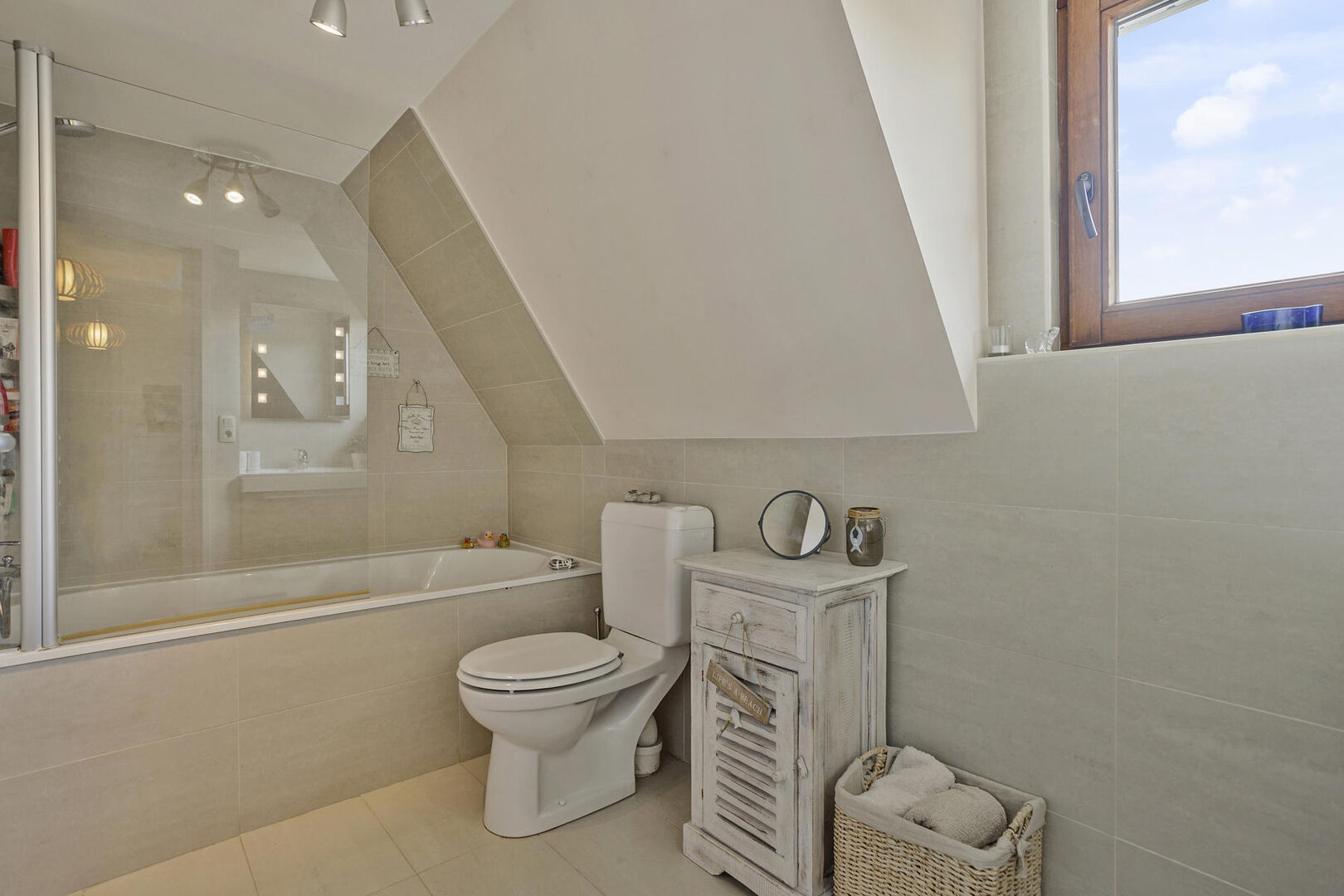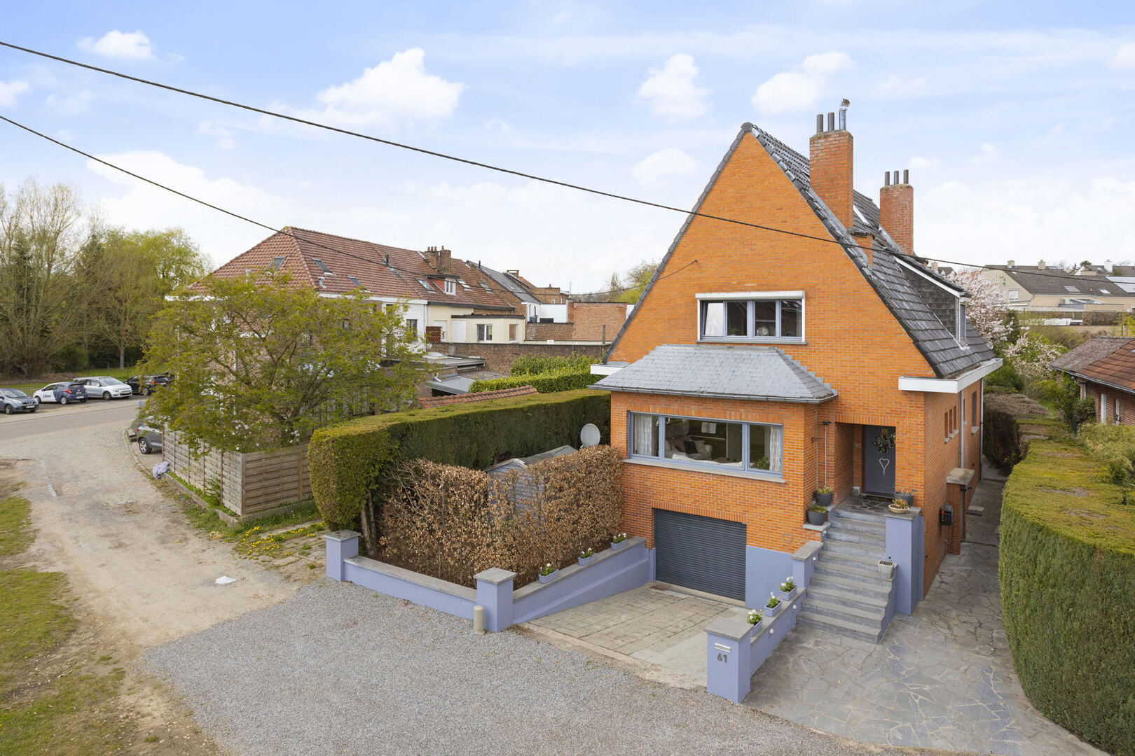 De woning bestaat uit: inkomhal 7.5 m² met toilet - woonkamer 21 m² met open haard - eetkamer 28 m² - volledig ingerichte open keuken 18.4 m²: koelkast met vriesvak, vaatwasmachine, microgolfoven, oven, keramisch kookvuur - 5 slaapkamers (waarvan 3 kamers met laminaat en ingebouwde kasten, 2 met tapijt): 16 m² / 11.7 m² / 14.5 m² /12.4 m² / 14.7 m² - badkamer 5.8 m² met bad/douche, lavabo in meubel en toilet - douchekamer 5,1m² met douchecabine en met toilet - garage 20,2 m² voor 1 wagen - kelder 45 m² met wasruimte - 2 buitenstaanplaatsen - privatieve tuin (or NW) met terras 12 m² (or NW).