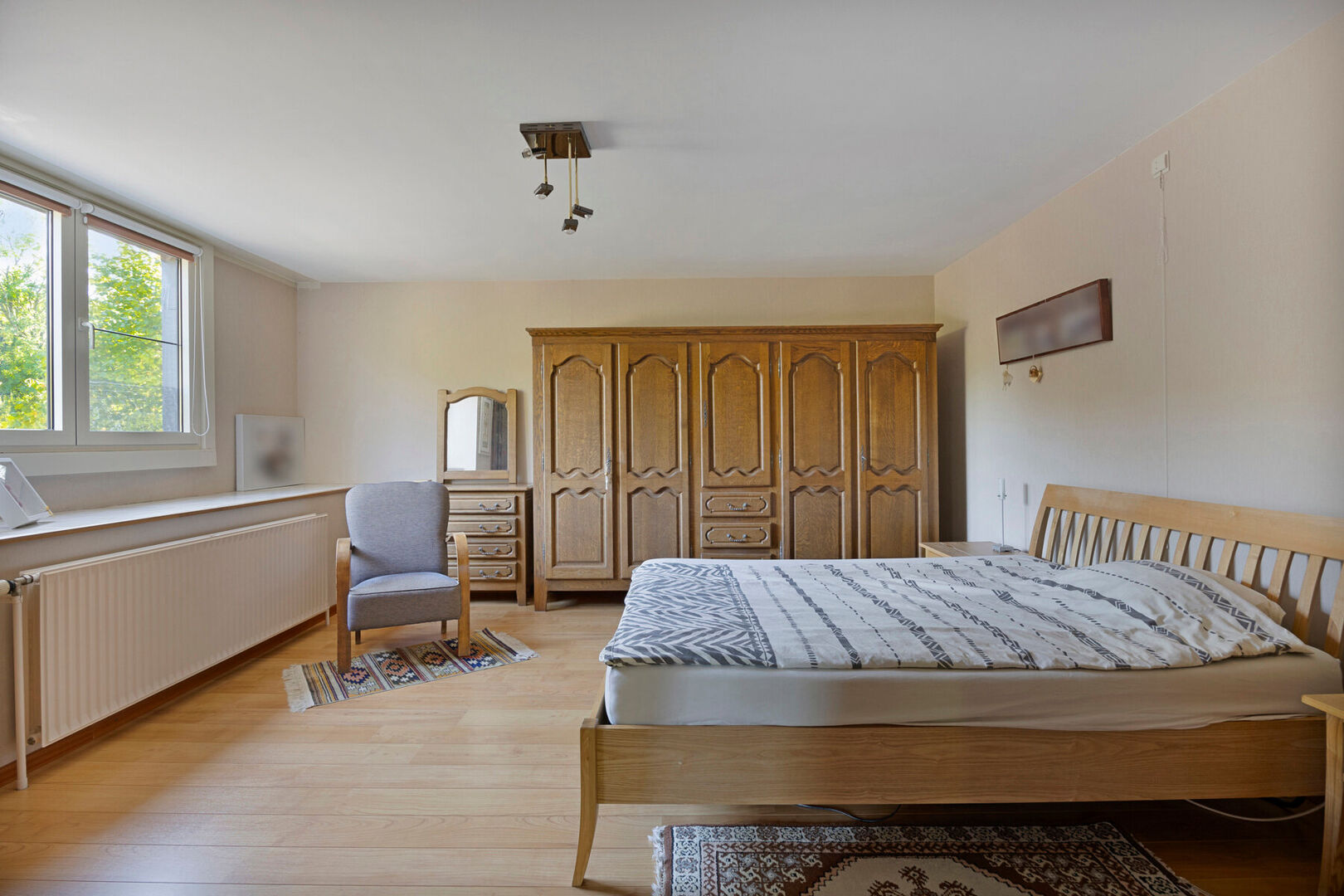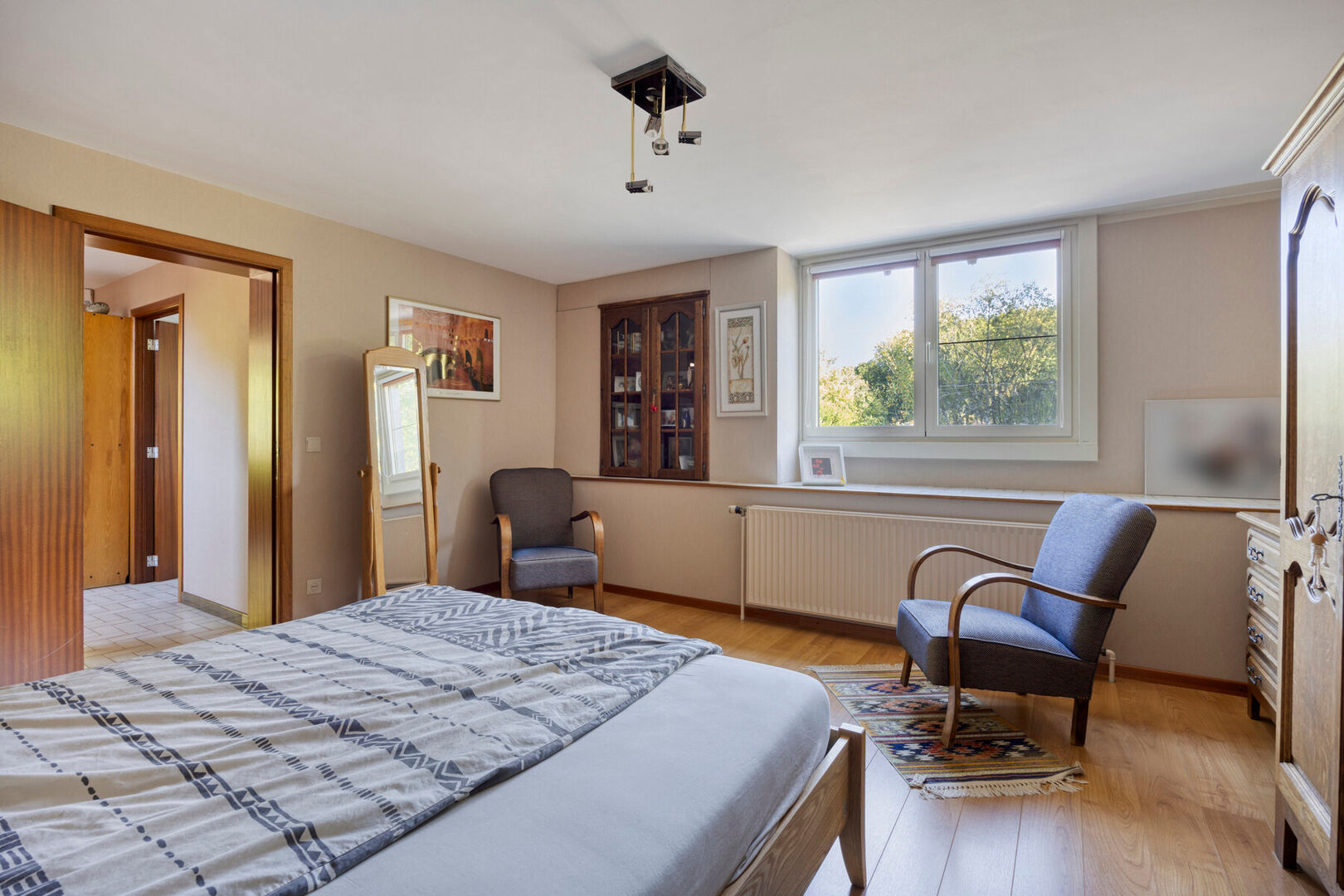 4 ruime slaapkamers, waarvan 1 zolderkamer die reeds de nodige voorzieningen heeft voor water, gas en electriciteit en waar eventueel mogelijkheid bestaat tot installatie van bad/douchekamer.